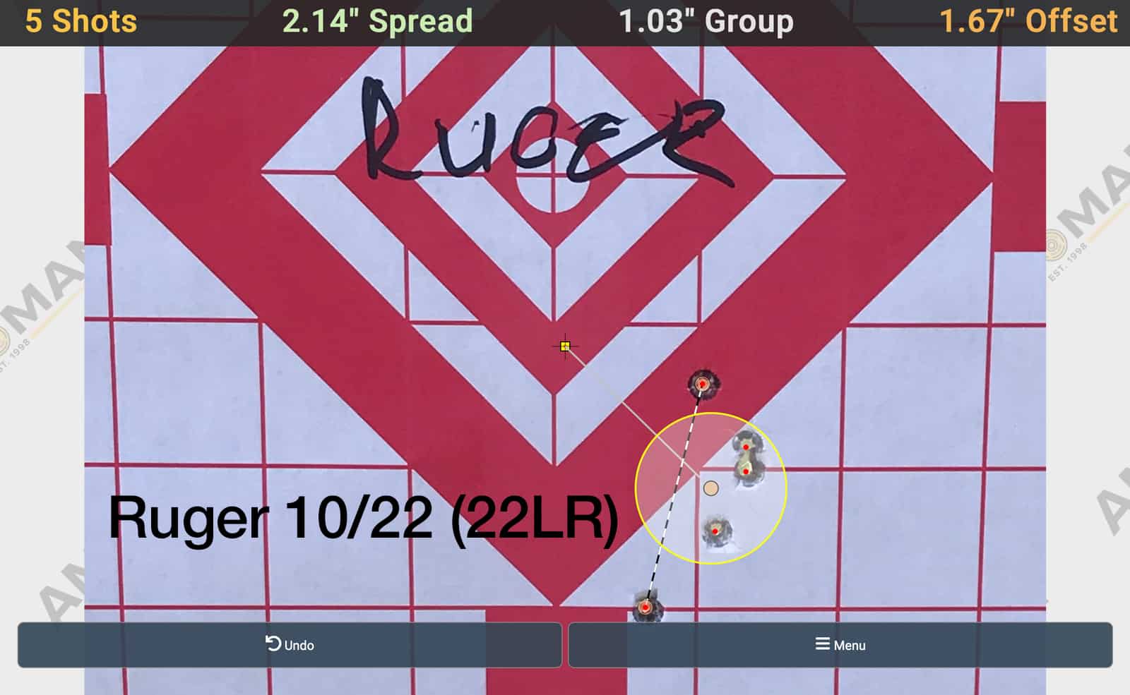 This is all well and good, but an AR-15 22 conversion kit needs to perform somewhat similar to a dedicated 22 rifle in order to be a useful tool, and not just a range toy. We swapped out the BCG inside of one of our AR-15s and brought it to the range, along with a Ruger 10/22. Both guns had 1x red dot optics on them. We shot from a rest at a target 50 yards away, and used a digital chronograph to measure the velocity of the rounds from each gun. We shot a five shot group using Federal Auto Match ammo, and compared the results using the Ammoman Shot Group Analyzer.